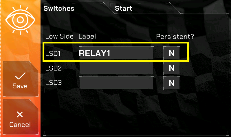 In the following screen, if you were configuring Low Side Driver 1 (LSD1) you will give it a name of 6 characters. We’ll just call it “RELAY1” for this example. Persistent (when set to Y) means when you PRESS the button (which you’ll see in a subsequent screen shot), it STAYS ON/OPEN, otherwise it is a MOMENTARY switch.