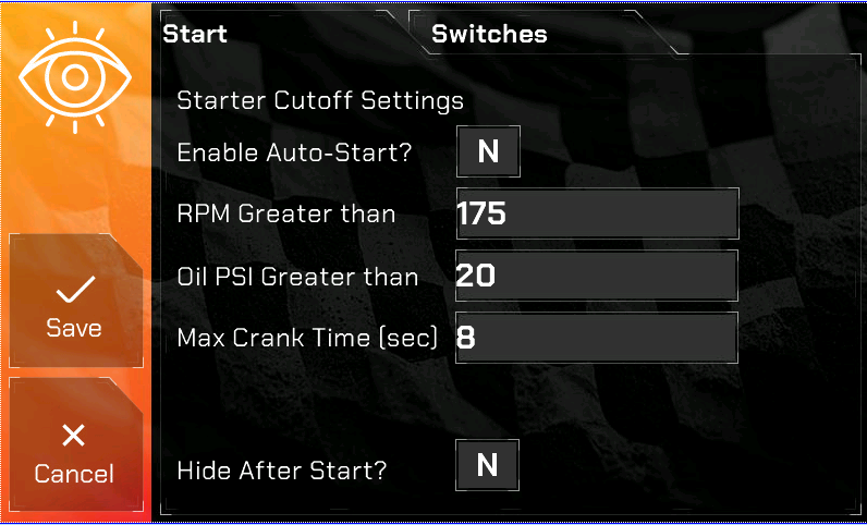 Oil PSI Greater than – This is currently not in use but will be in a future update. This is a safety check. If oil PSI reaches this value (and RPM target is met), the starter disengages as a successful start. If oil PSI stays below this value, the starter will continue cranking until the max crank time runs out.